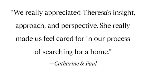 Theresa's experience as a real estate investor has given her a strategic edge in negotiating deals, ensuring that her clients receive the best possible outcome. Her tough negotiation skills combined with her trained design eye, provide an advantage when it comes to selling homes, as she is able to highlight the most desirable features of a property and stage it to sell quickly.